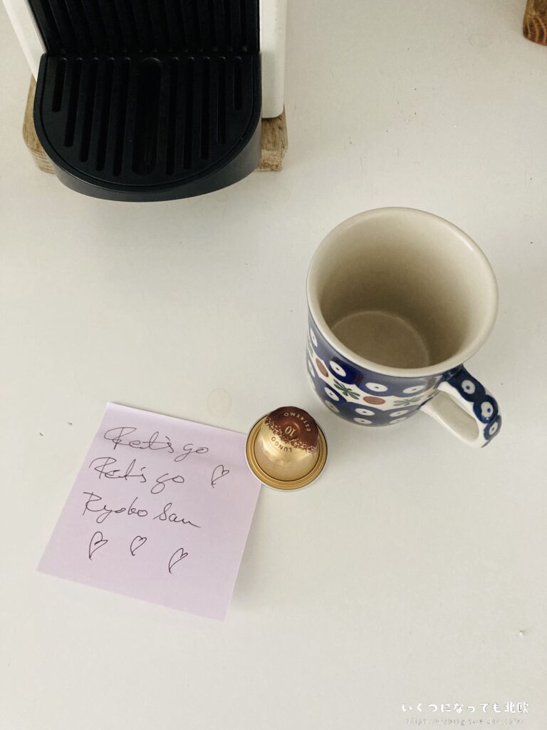 当日の朝、自宅のコーヒーマシンのそばに、サンボからの応援メッセージがありました。展示会場で特にスピーチするわけでもなく、何も心配することはないのですが、「もしかしたら誰かと何か話すかもしれない」と、自分のスウェーデン語力に自信のない私は余計な心配をして緊張していたのです。またサンボと私は起床時間と就寝時間がそれぞれ違うので、朝起きたらサンボからのメッセージが付箋にあるということがしばしばあります。この日の応援メッセージは、日本の野球観戦に影響を受けた彼ならではの冗談まじりのものでした。しかも “Let’s go” ではなく “Ret’s go” となっていて日本人の「レッツゴー」の発音仕様になっています笑。